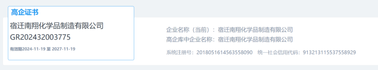 近日,從江蘇省高新技術(shù)企業(yè)認(rèn)定管理工作領(lǐng)導(dǎo)小組傳來(lái)喜訊,宿遷南翔化學(xué)品制造有限公司成功入選江蘇省認(rèn)定機(jī)構(gòu)2024年認(rèn)定報(bào)備的第二批高新技術(shù)企業(yè)備案名單 !這一殊榮的獲得,不僅是對(duì)南翔化學(xué)品在科技創(chuàng)新領(lǐng)域的高度認(rèn)可,更是公司發(fā)展歷程中的一個(gè)重要里程碑。