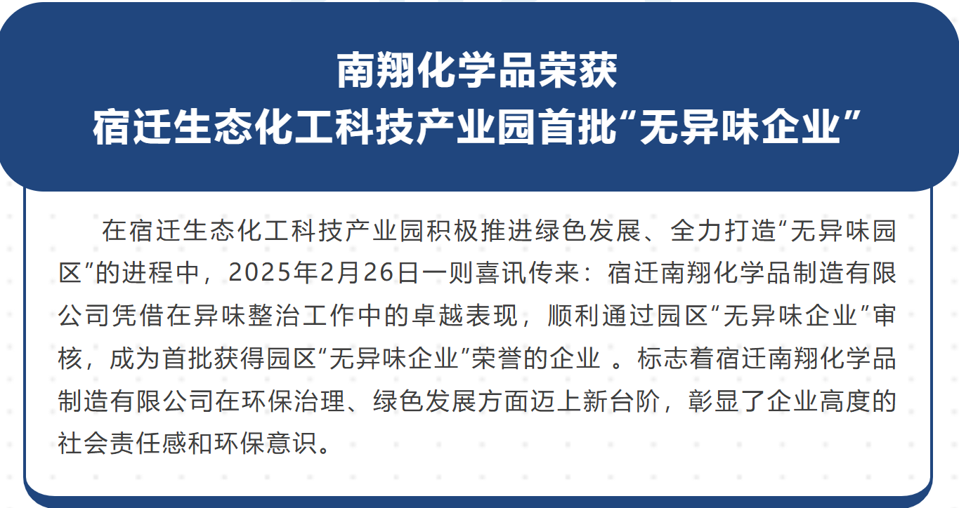 此次榮獲園區(qū)“無異味企業(yè)”的稱號,是對公司長期以來堅持綠色發(fā)展的充分肯定, 也將激勵企業(yè)繼續(xù)踐行環(huán)保責(zé)任,為建設(shè)美麗園區(qū)貢獻力量。宿遷南翔化學(xué)品制造有限公司將以此為契機,不斷提升環(huán)保管理水平,持續(xù)改進生產(chǎn)工藝,努力打造資源節(jié)約型、環(huán)境友好型企業(yè),為實現(xiàn)高質(zhì)量,可持續(xù)發(fā)展目標(biāo)而不懈奮斗!